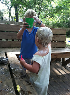 This is where the two minutes from the post title comes into play. Left these guys on the porch for two minutes to "blow bubbles"while I was on the phone with IKEA (because yesterday I forgot to order/pay for a few major items on my list to be delivered to us-how did I do that???) Anyway, nonsense information that does not pertain to what was happening outside at the same time. I mean, y'all!???!!!! What to do with these two??? I promise everything that child (Mr. Big) touches turns into a disaster!!! Magic Marker up the arms, down the diaper, bubbles in the hair, dog poop on his hands, what else....I could not help but snap a few photos-he was having a ball...until it got in his eyes...a whole other story